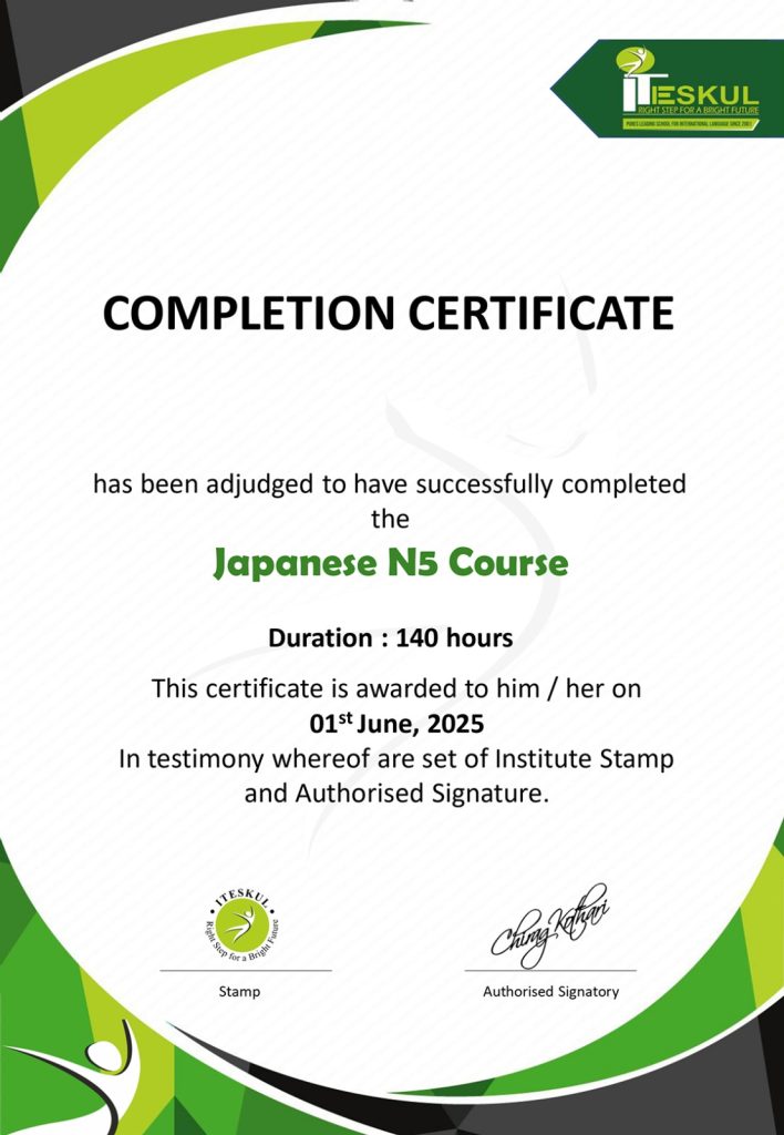 The Japanese language course at ITESKUL provides a thorough education, taking you from the very beginning to the very end (N5-N1). Learn about Japanese culture, improve your communication abilities and open doors to fascinating business, technological and cultural exchange prospects. Learning Japanese language is made interesting and fulfilling by our experienced mentors and immersive teaching strategies.